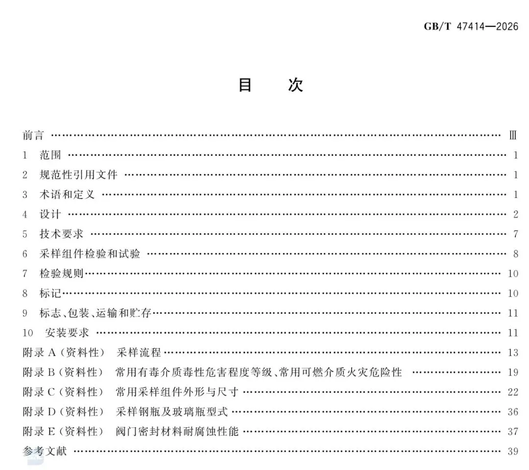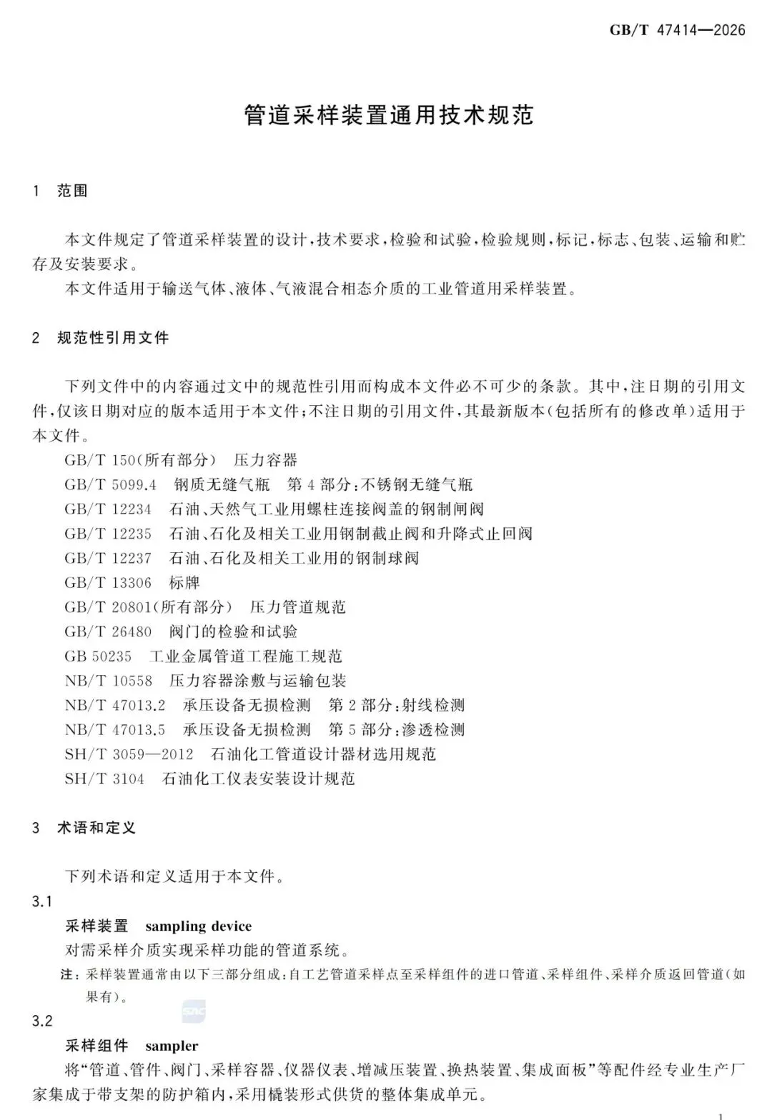 可下载 | GB∕T 47414-2026管道采样装置通用技术规范【 下载方式】如需下载源文件可关注公众号后台留言“GB∕T 47414-2026管道采样装置通用技术规范”来源: 公开网络 如有侵权请联系删除免责声明:转载的内容来源于互联网及微信公众号等公开渠道。推发该文目的是传递更多信息,文章仅供参考和交流。转载的稿件版权归原作者和机构所有,若出现内容错误,请联系我们,我们将及时更正。如有侵权,请联系我们删除。专家原创文章推荐:机械、电气、仪表等专业是化工、化学、安全相关专业吗?工业建筑到底啥条件下需要设置火灾自动报警系统?装置内的变配电室需要不需要做抗爆设计?化工企业中试、试生产期间的产品到底能否对外销售?危险化学品储存现状及对策▶化工•焦点访谈回放