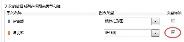先做好柱状图,右键点击增长率系列 → 更改图表类型 → 勾选次坐标轴 → 设为折线图。