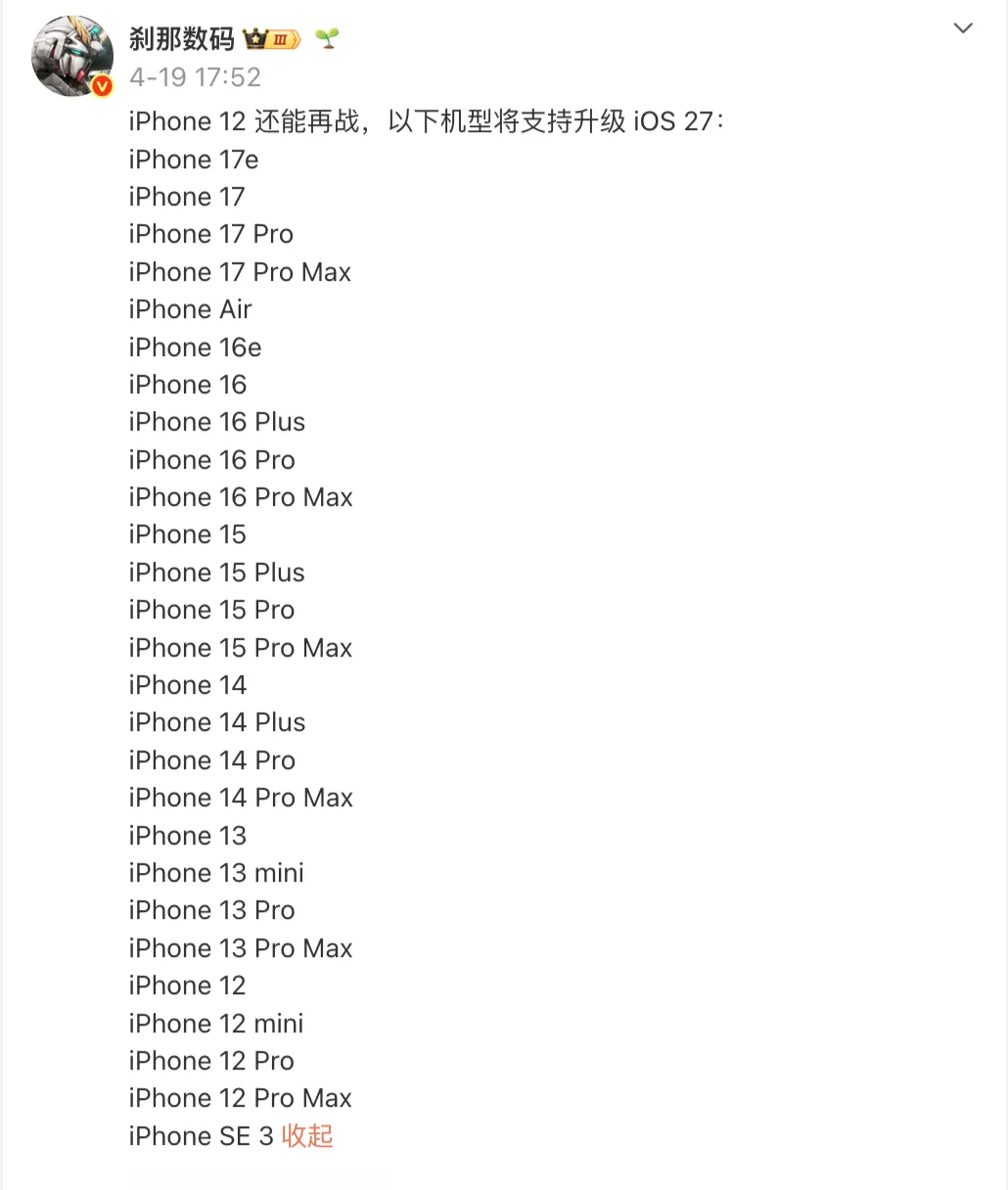 也就是说,这4款老iPhone将止步于iOS 26系统了,iPhone12系列将成为支持iOS 27最老的机型。