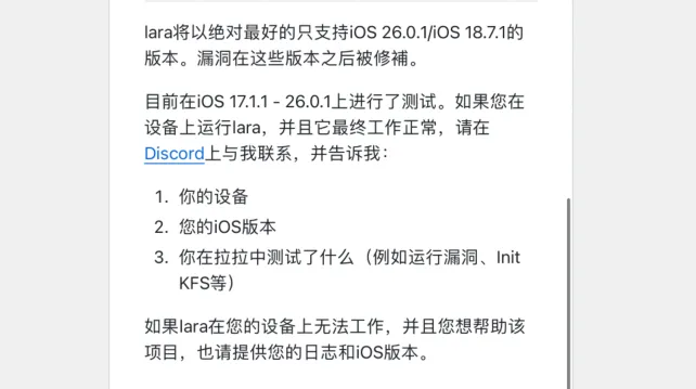 支持 iOS 17.1.1 至 iOS 26.0.1 系统,由于 MTE 无法在M5、A19和A19pro上工作,所以 iPhone 17 系列设备并不支持。