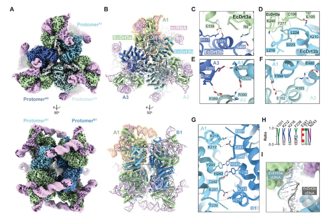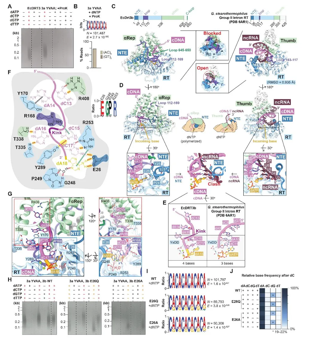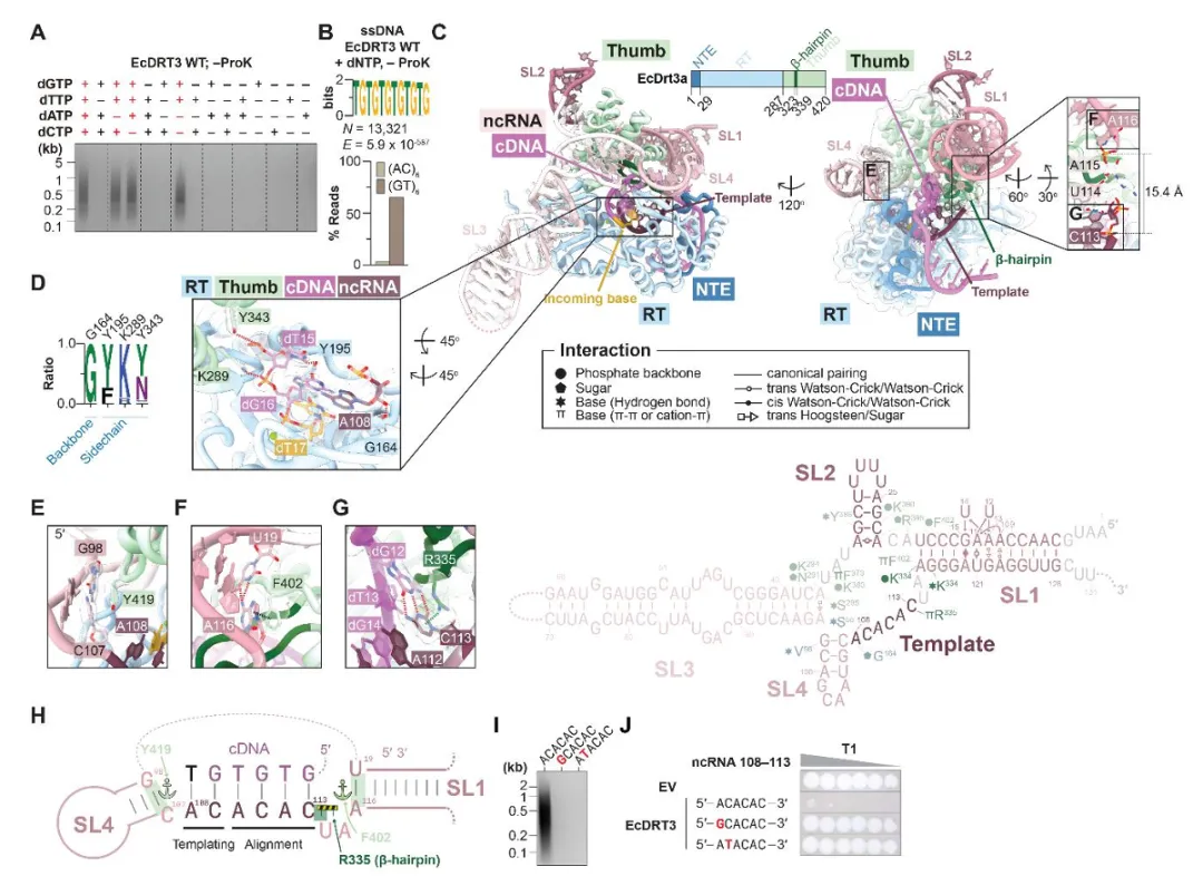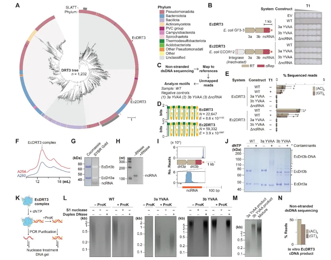 图1: 展示了DRT3系统广泛存在于各种细菌中,具有抗噬菌体功能,并能持续合成“多聚GT/AC”双链DNA。生化实验证明该复合物稳定存在,且Drt3b合成的DNA会共价连接在自己身上