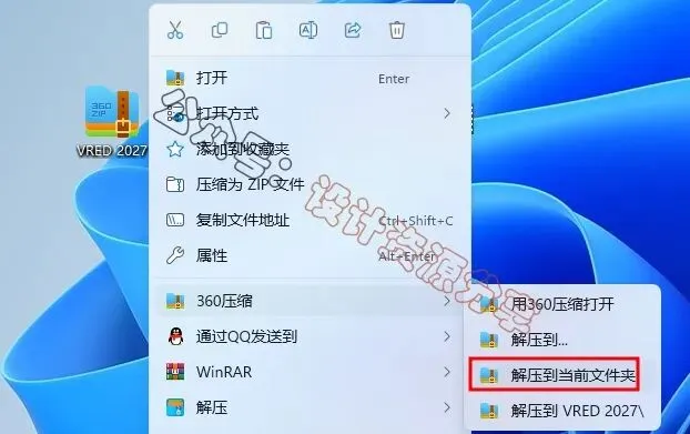 1、下载VRED 2027软件安装包到电脑上,右键选择【解压到当前文件夹】