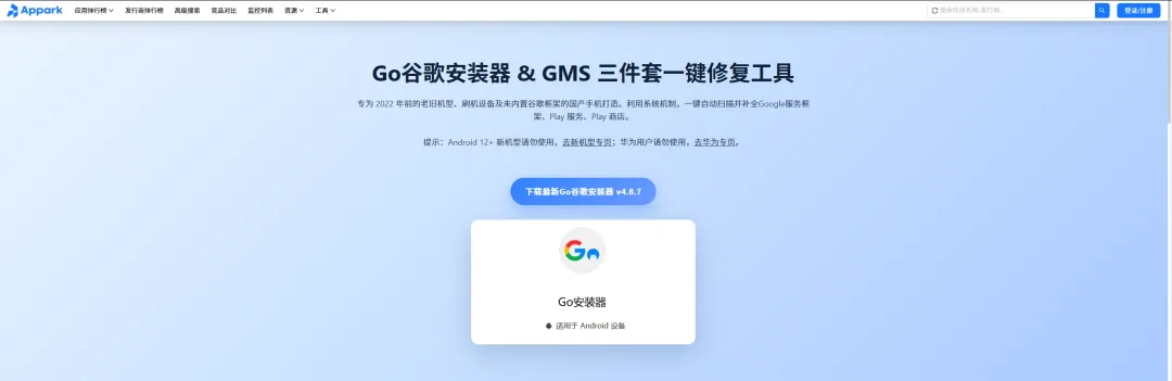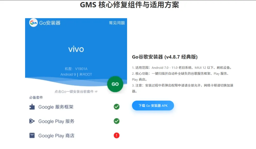 如果你的手机是比较老的机型,或者是没有内置谷歌底层框架的低端机(找不到前面说的开关),别灰心,我们还有一套通过“GO 安装器”手动补全框架的方案。