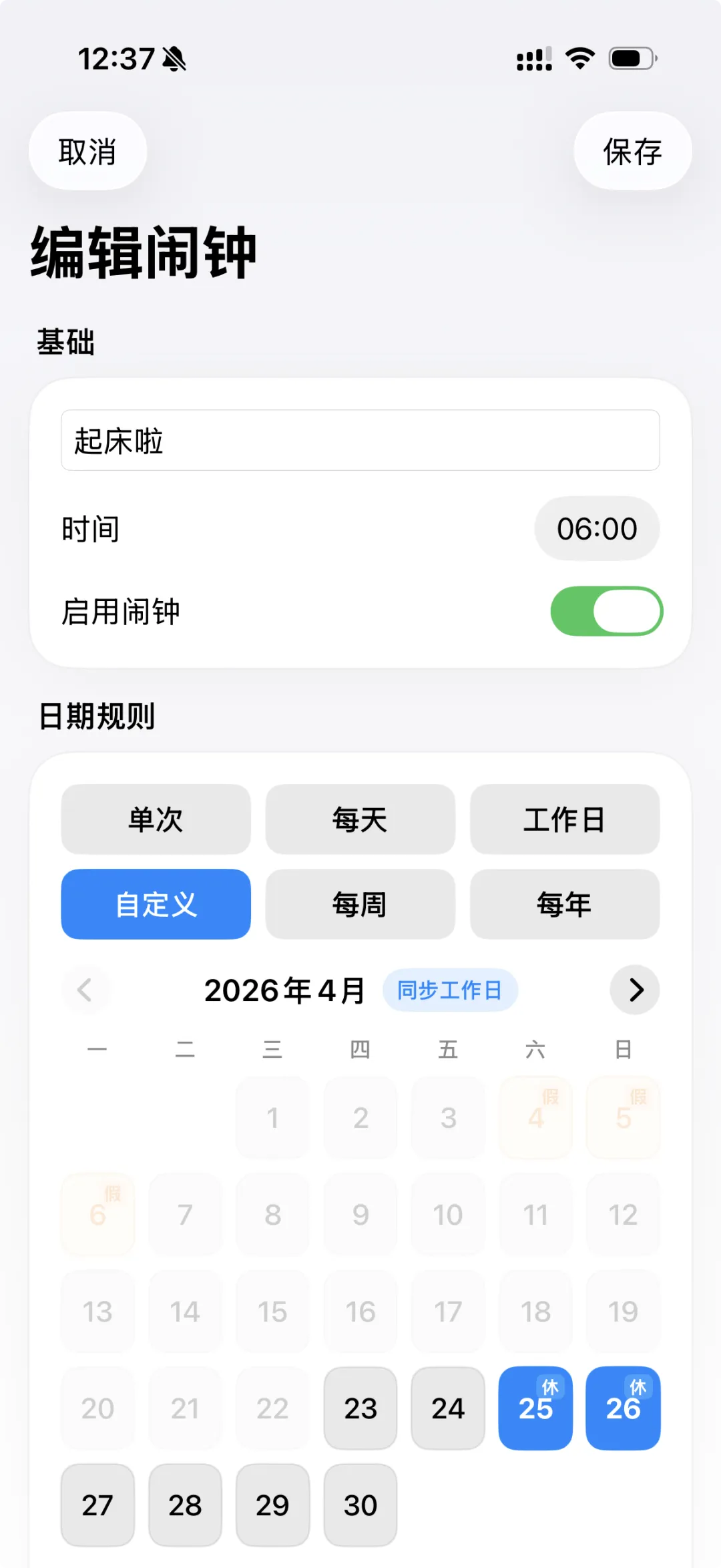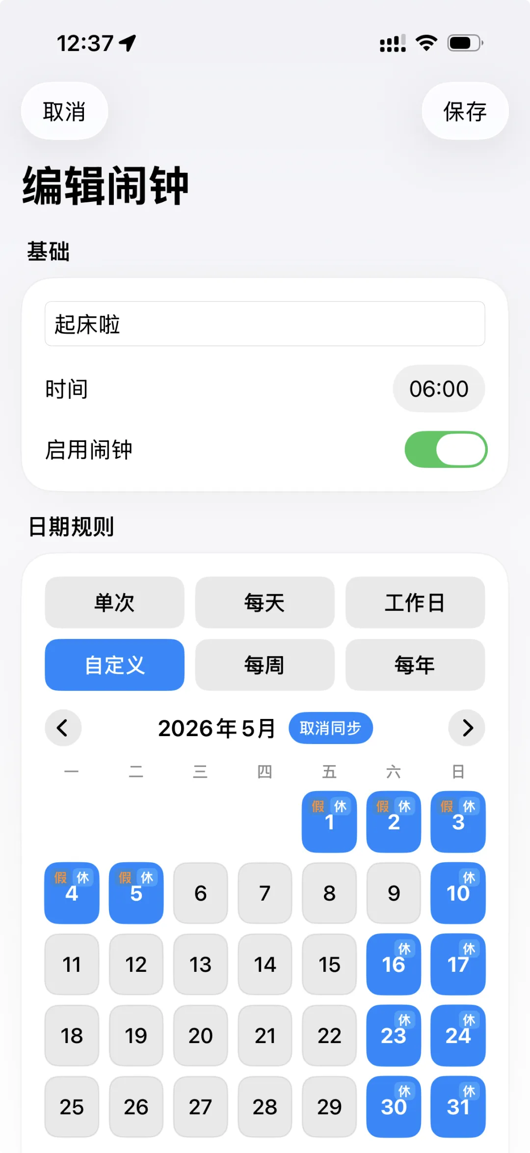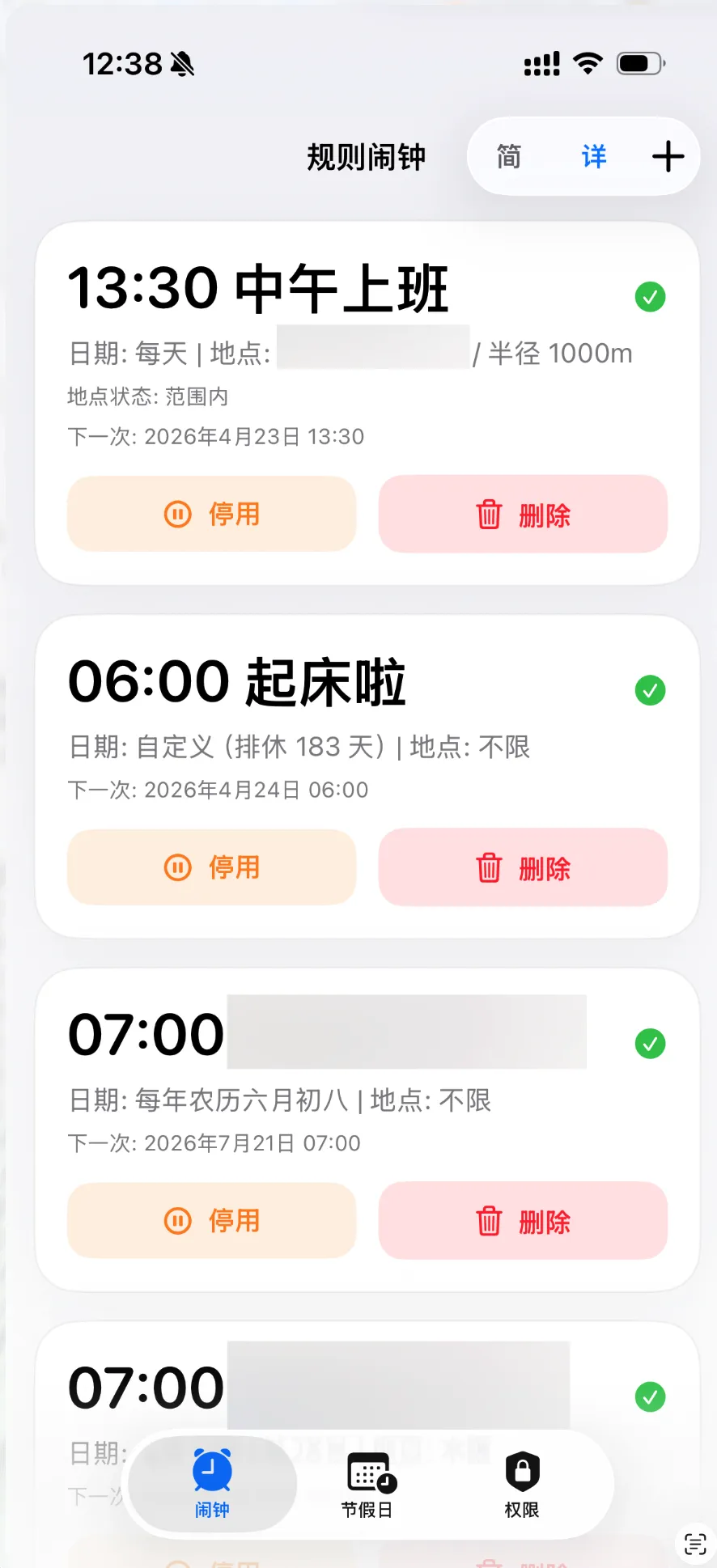 对于灵活调班的,我一直想不到有什么好的解决办法,甚至想过重写一个排班软件,然后用这个APP去对接,但是这样的话就没有什么通用性了。也想过自己上传json去读,但是这个也麻烦。最后终于灵机一动,改成了自定义,可自动导入本年和次年的节假日数据,然后遇到有微调的,自己再进去点一下就好了,这样就完美解决了问题。删除了以前适用性不大的特殊规则。点击阅读原文下载。我把自己想要的闹钟做出来了:假日地点闹钟,已经上架 App Store