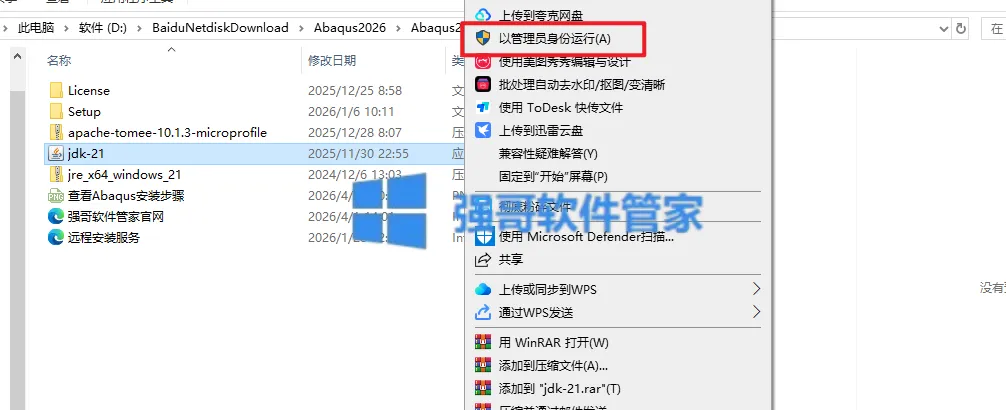 2.打开解压包,右击【jdk-21】选择【以管理员身份运行】