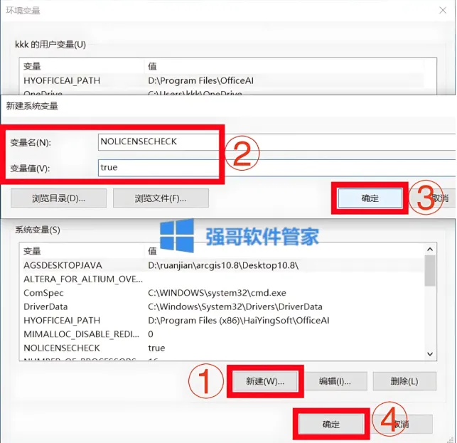 15.创建环境变量:①点击系统变量下的【新建】②输入变量名【NOLICENSECHECK】和变量值【true】③点击【确定】④点击【确定】。