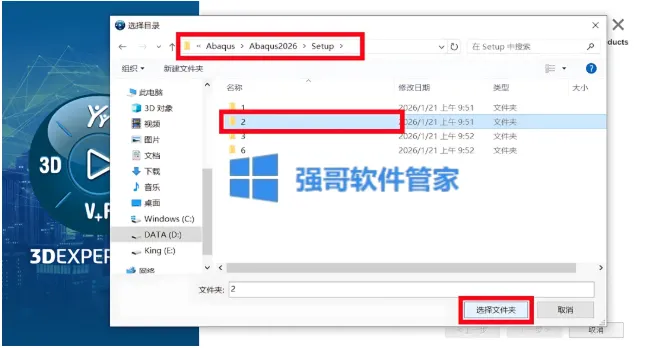 40.打开安装包解压后的【Abaqus2026(64bit)】文件夹中的【Setup】文件夹,选中【2】文件夹,点击【选择文件夹】