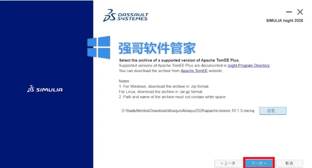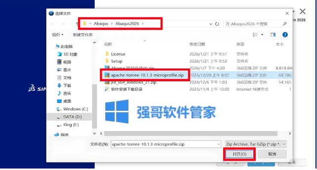 67.打开安装包解压后的【Abaqus2026(64bit)】文件夹,选中【apache-tomee-10.1.3-microprofile】压缩包,点击【打开】