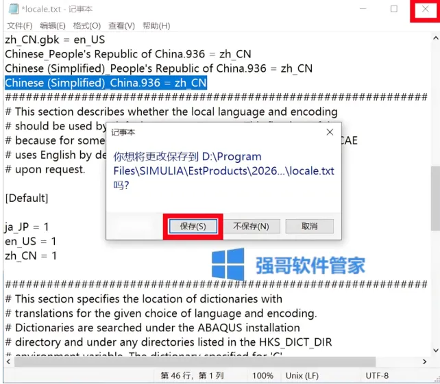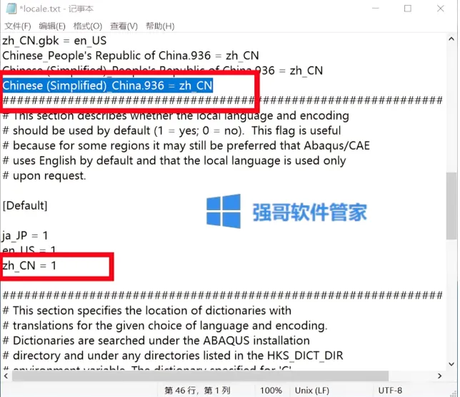 6.在第二行“########……”前加上【Chinese (Simplified)_China.936 = zh_CN】,在第三行“########……”前,将【zh_CN = 0】改为【zh_CN = 1】