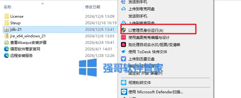 2.打开解压包,右击【jdk-21】选择【以管理员身份运行】