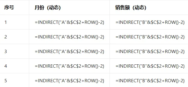 INDIRECT("A"&$C$2+ROW()-2):$C$2是我们后续要绑定滚动条的控制单元格,ROW()会自动获取当前行号,通过计算实现从基础表中连续取数;