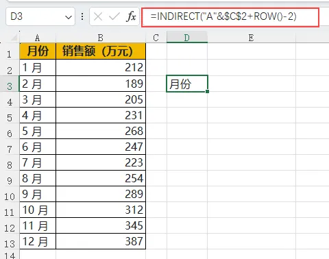 选中 D3 单元格,输入公式:=INDIRECT("A"&$C$2+ROW()-2)