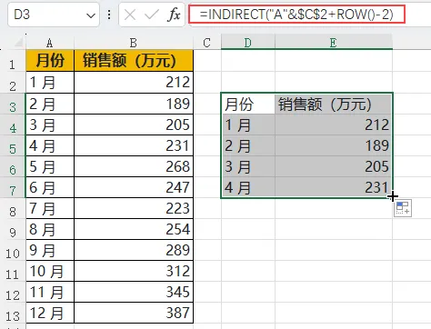 当C2=1时,动态区显示 1-5 月数据;C2=2时,显示 2-6 月,以此类推,直到C2=8时,显示 8-12 月数据,完美覆盖全年。