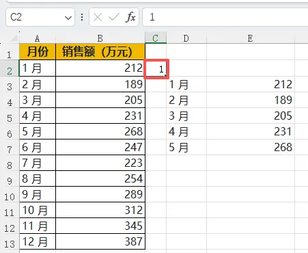 在C2单元格输入初始值1,此时动态区会自动显示 1-5 月的完整数据,公式搭建完成。