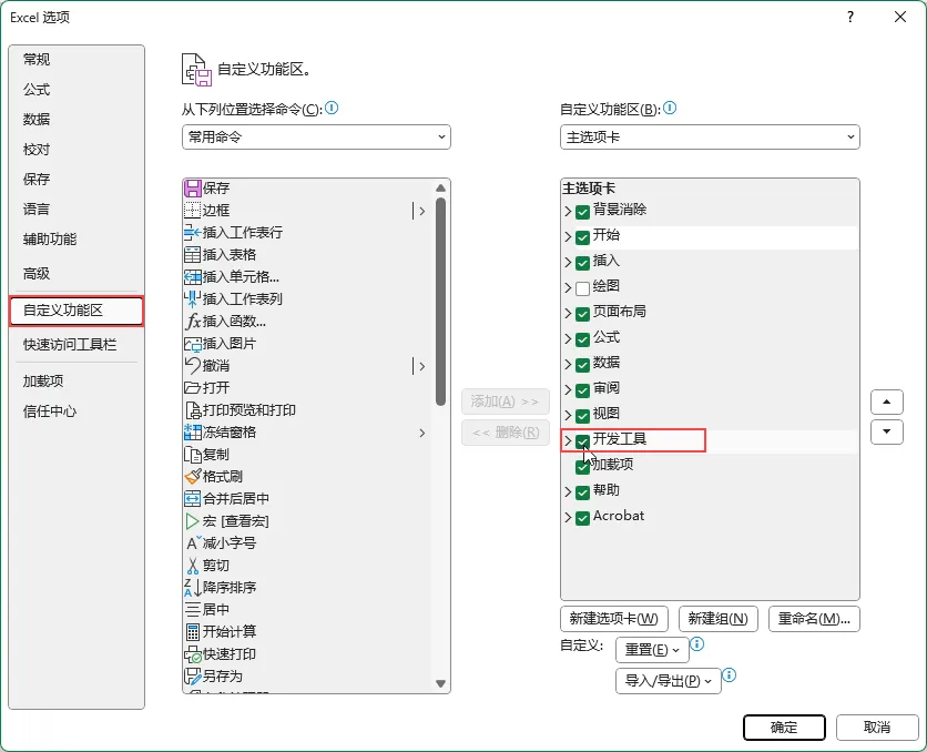 在右侧主选项卡中,勾选【开发工具】,单击【确定】,顶部菜单栏就会出现「开发工具」选项卡。