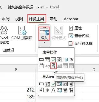 单击【开发工具】→【插入】,在「表单控件」中选择滚动条(窗体控件)(注意不要选 ActiveX 控件);