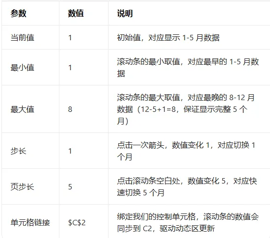 若需要显示 6 个月数据,只需将动态区扩展为 6 行,滚动条最大值修改为12-6+1=7即可,公式无需修改;