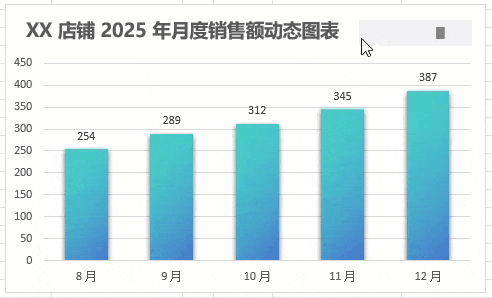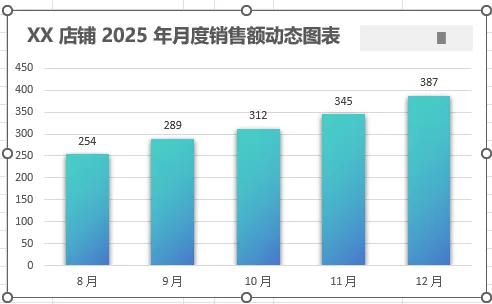 添加标题:单击图表,在「图表元素」中勾选「图表标题」,修改为「XX 店铺 2025 年月度销售额动态图表」,并设置字体、颜色、大小以及位置;