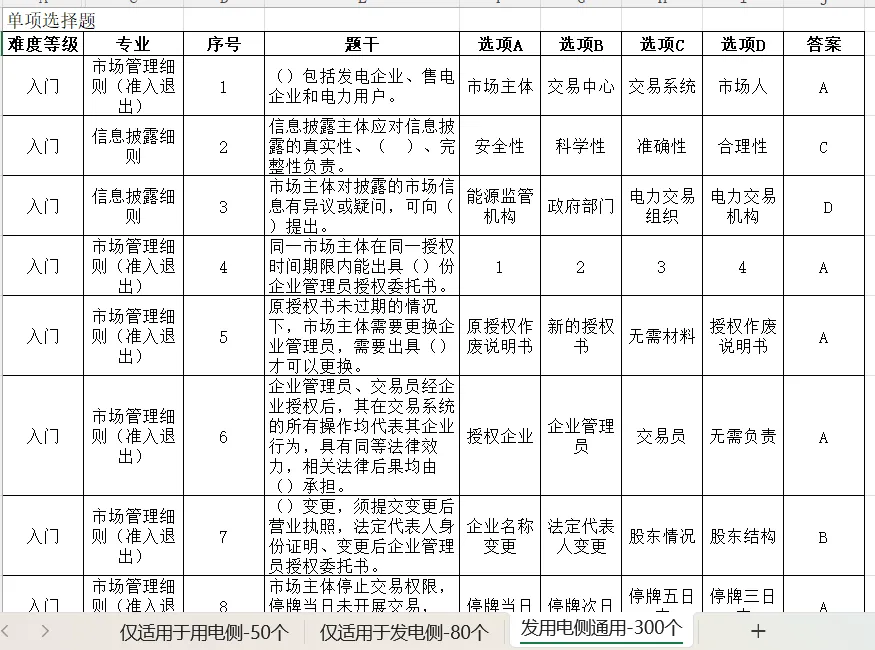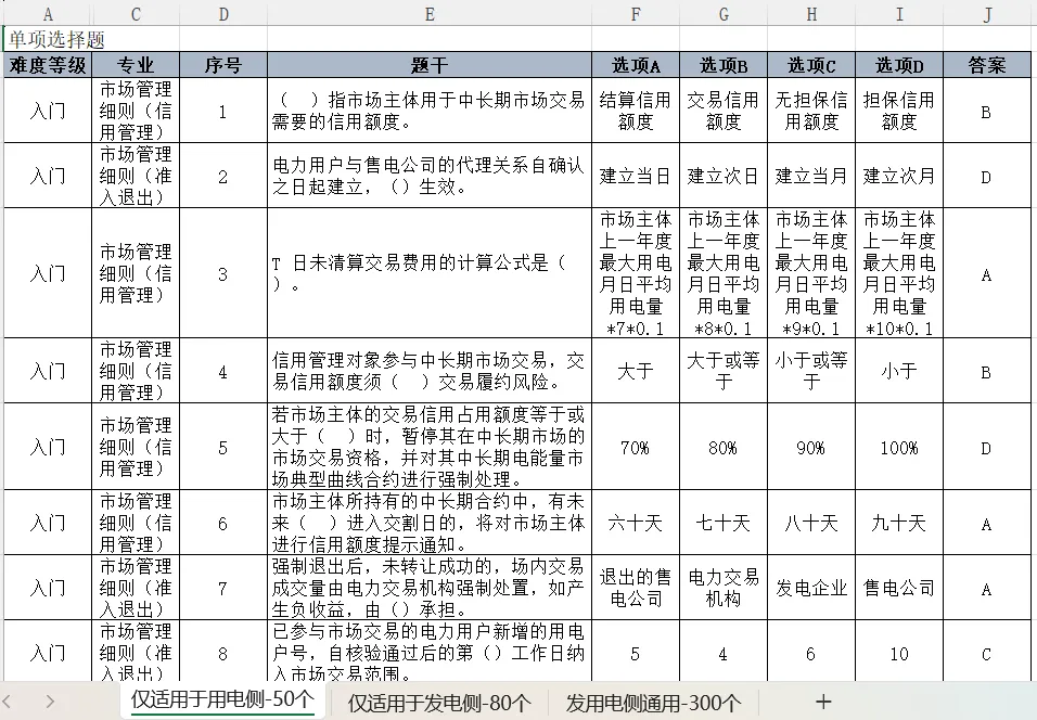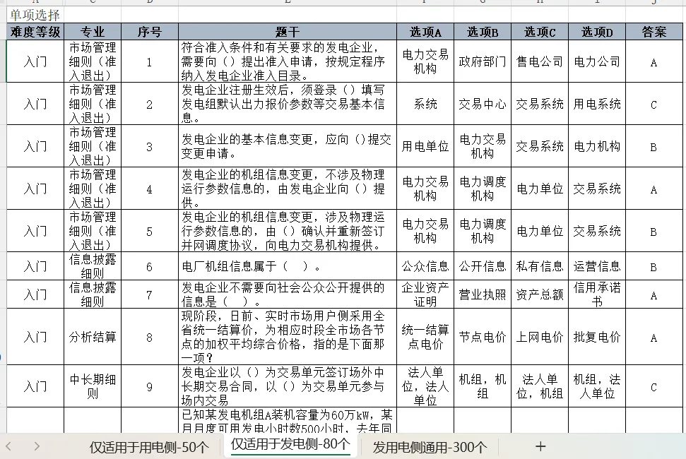 电力现货基础理论试题库Excel表-430个选择题