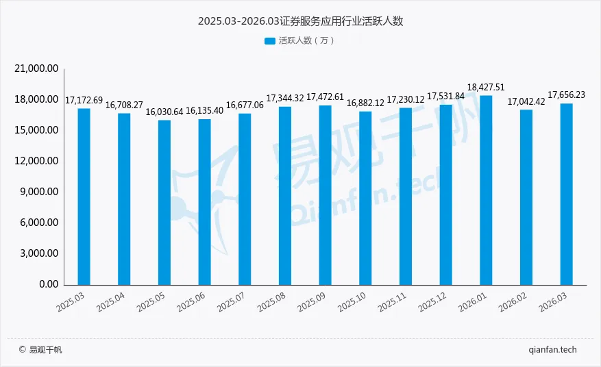易观千帆最新数据显示,2026年3月证券服务应用行业整体活跃人数达1.77亿,券商自营与第三方市场双双回暖。各家APP通过密集的功能迭代与体验优化,在激烈的用户争夺战中各显其能。