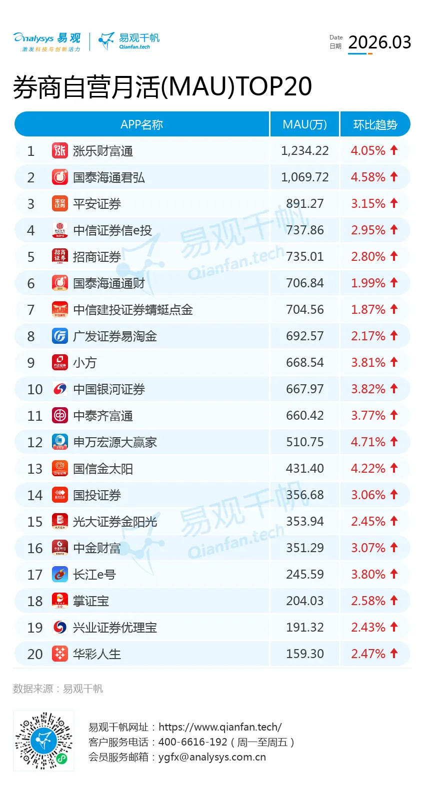 2026年3月,券商自营APP活跃人数排名中,“涨乐财富通”以1234.22万的活跃人数稳居榜首,环比增长4.05%,用户规模与增长势头双优。