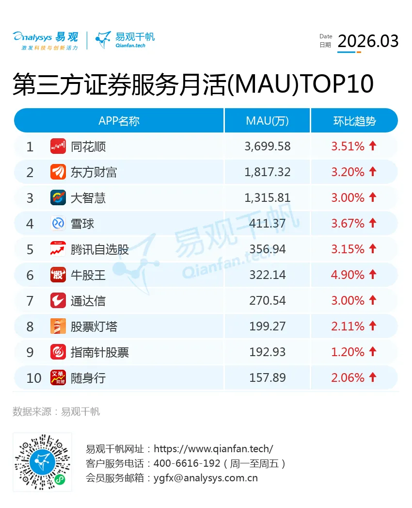 2026年3月,第三方证券服务应用活跃人数排名中,“同花顺”以3699.58万的活跃人数断层领先,环比增长3.51%,市场占有率近半,展现出强劲的市场竞争力和用户粘性。