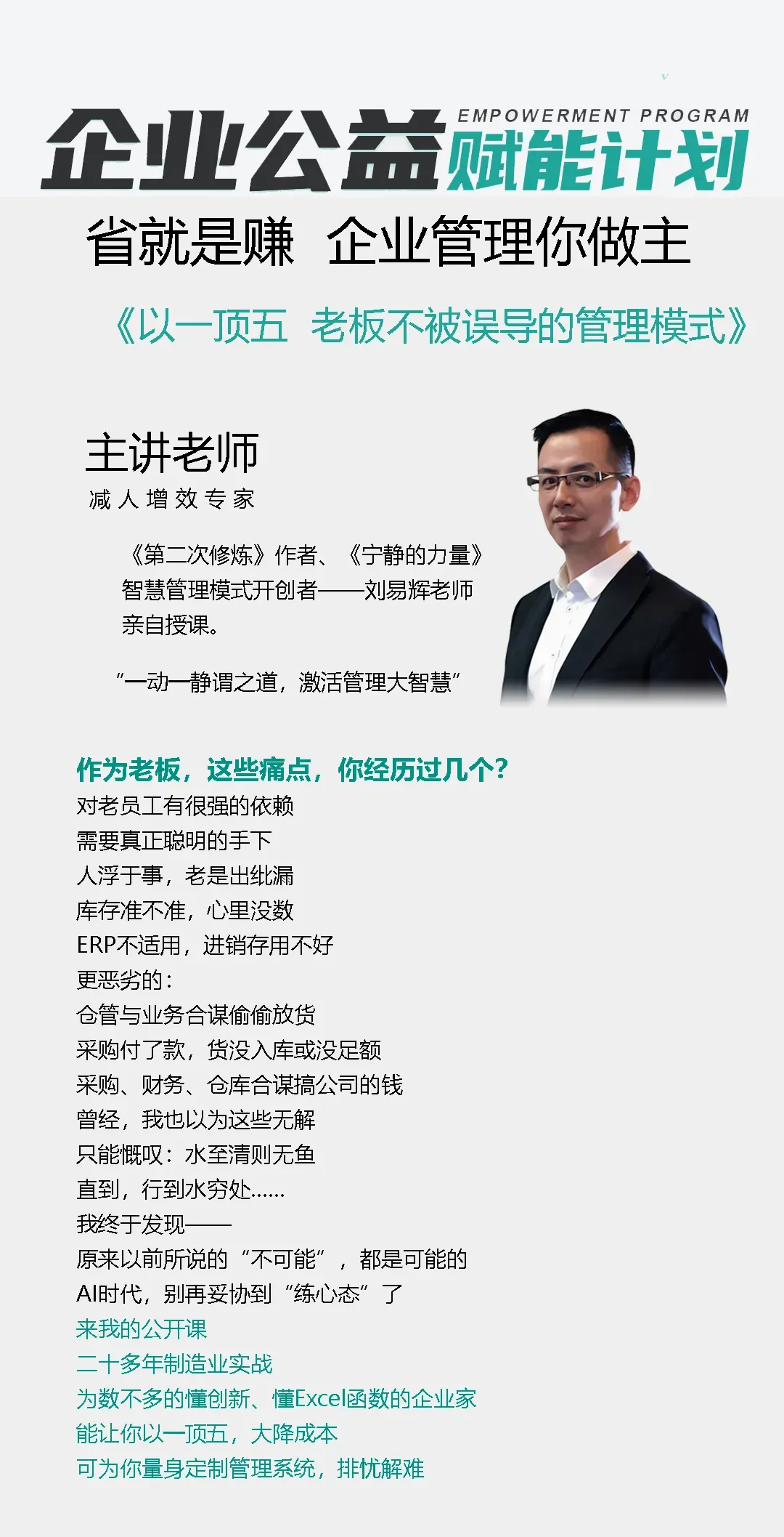 ✅ 一套可落地的Excel管理模板→ 自动拆单生成各种生产单、配件单、送货单及采购文件、自动算周转率、自动预警超采✅ 舞弊检测机制→ 防范管理漏洞,系统自动标红✅ 老板专属“决策仪表盘”→ 一眼看清谁在赚钱、谁在亏、哪里在漏✅ 不被情绪和焦虑绑架的管理心法→ 每天10分钟《禅六式》,稳住能量和判断力