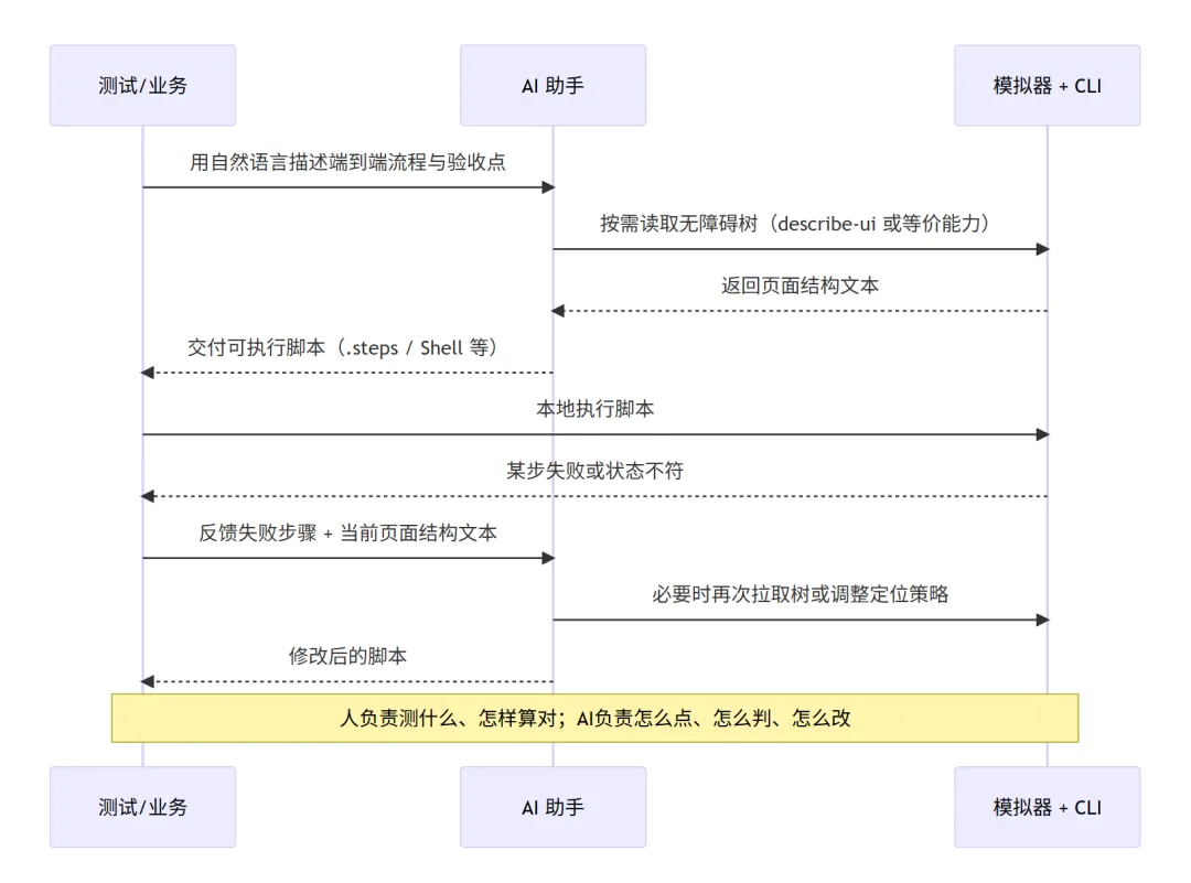 经验法则:默认仍以 describe-ui 无障碍树为主;遇到复杂原生页、Web 页树信息不足时,再用 AXe 截图 + AI 做结果校验或反推坐标,与「只靠树或只靠人眼」相比,路径更灵活。