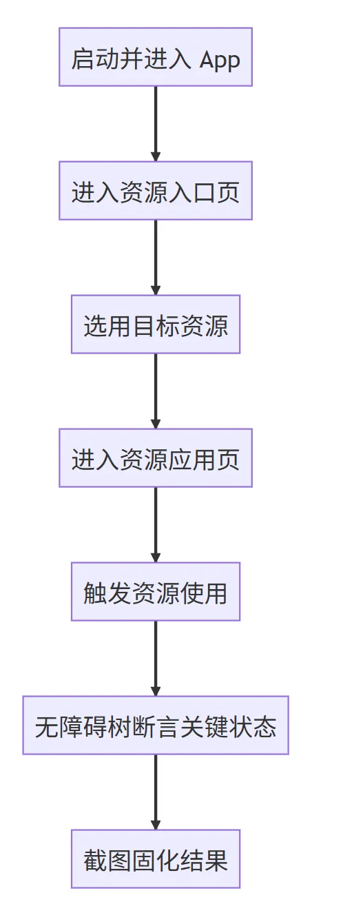 流程:打开App -> 进入资源页选择目标资源 -> 跳转到应用页使用资源 -> 截图留存。
