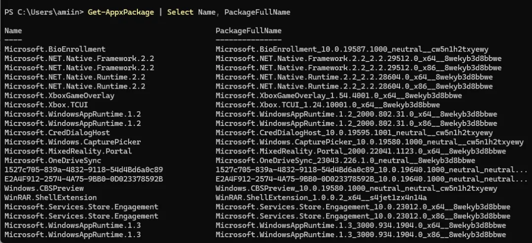 # 查看 UWP 应用列表Get-AppxPackage | Select Name, PackageFullName