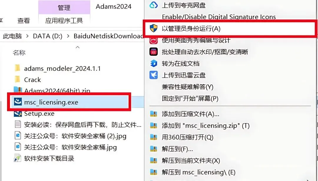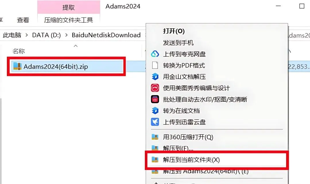 1.下载ADAMS2024软件安装包到电脑上,右键选择【解压到当前文件夹】。
