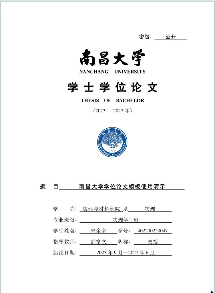 适用于南昌大学学术型研究生、专业型研究生、本科生毕业(学位)论文撰写的 模板。借助现代 LaTeX 技术,希望达到用户接口简明、内容格式规范和模板样式 可定制的统一。