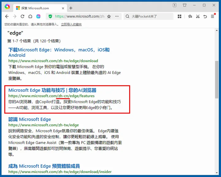 然后在其中搜索“Edge”,就能找到Edge的官方主页了。注意可能会有多个搜索结果,要认准地址中带“zh-cn”字样的才是中国大陆简体中文版的页面。
