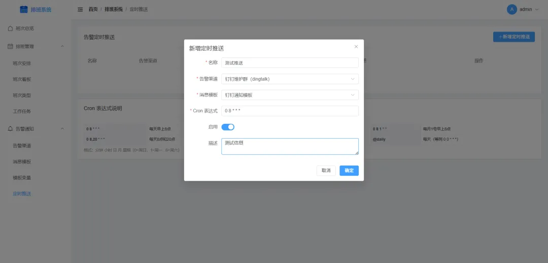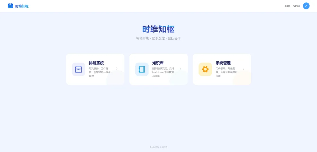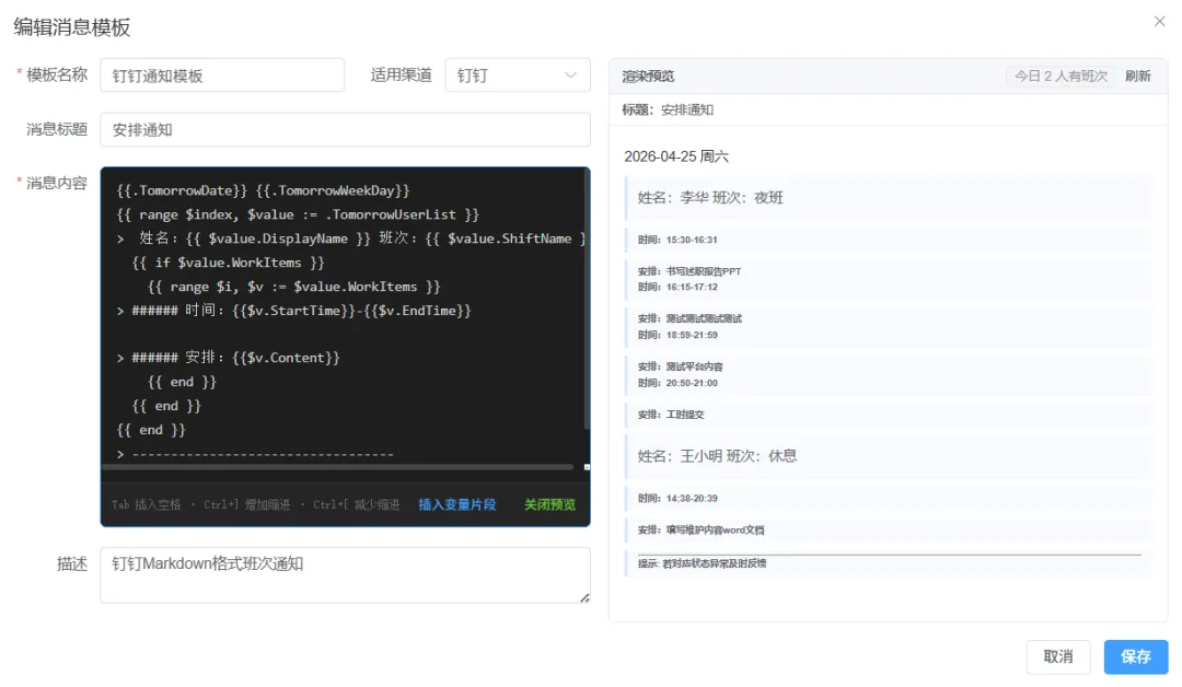 时维知枢是一套面向运维/值班团队的一体化工作平台,整合了班次排班、工作任务、消息告警和知识库四大模块,支持钉钉/飞书/邮件多渠道通知,提供灵活的模板变量系统和定时推送能力。