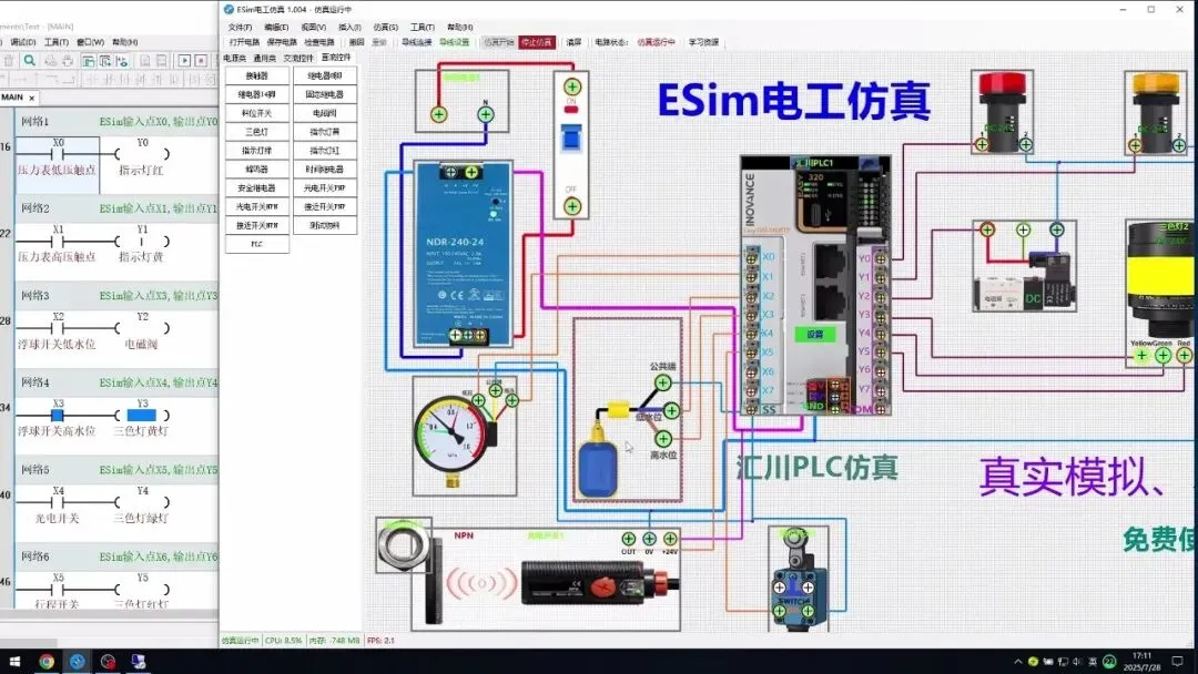·工具栏"学习资源"按钮:打开本地 study.html 页面("ESim工控学习平台",含PLC学习资源、电工基础教程、3D模型库等链接)