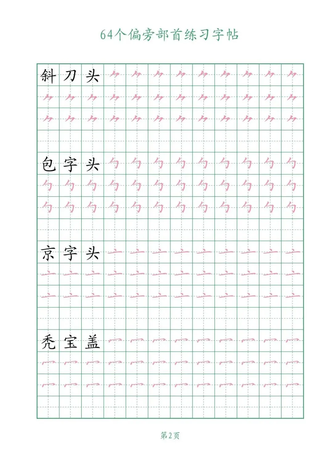 这份64个偏旁部首练习字帖【可下载可打印】完整电子版共6页