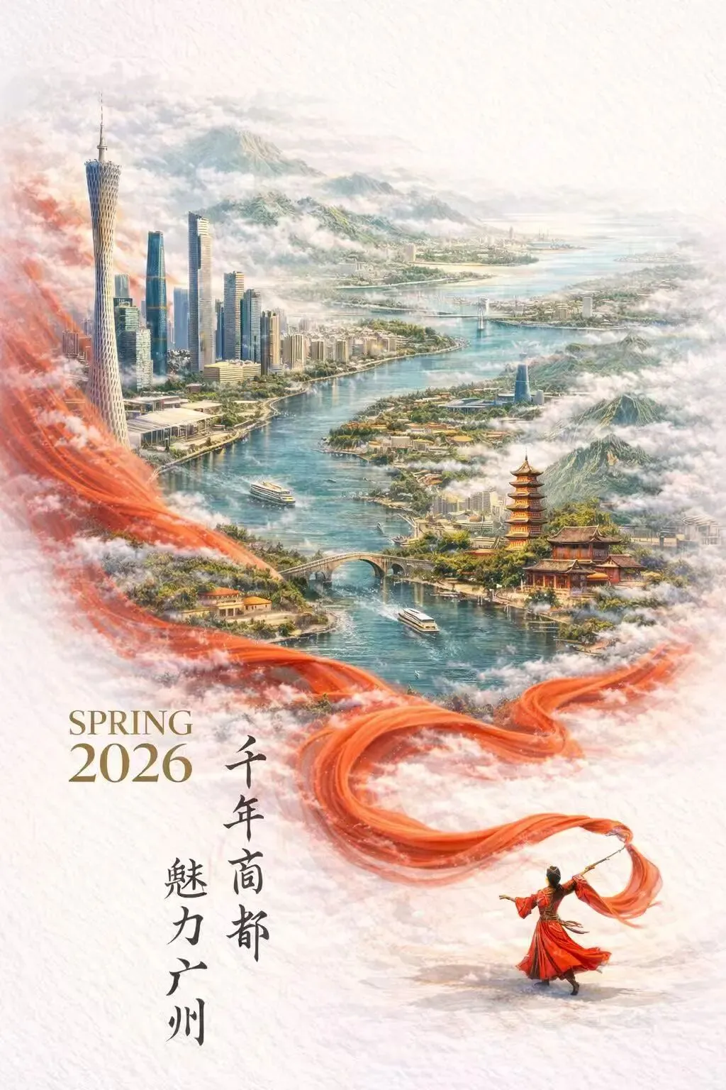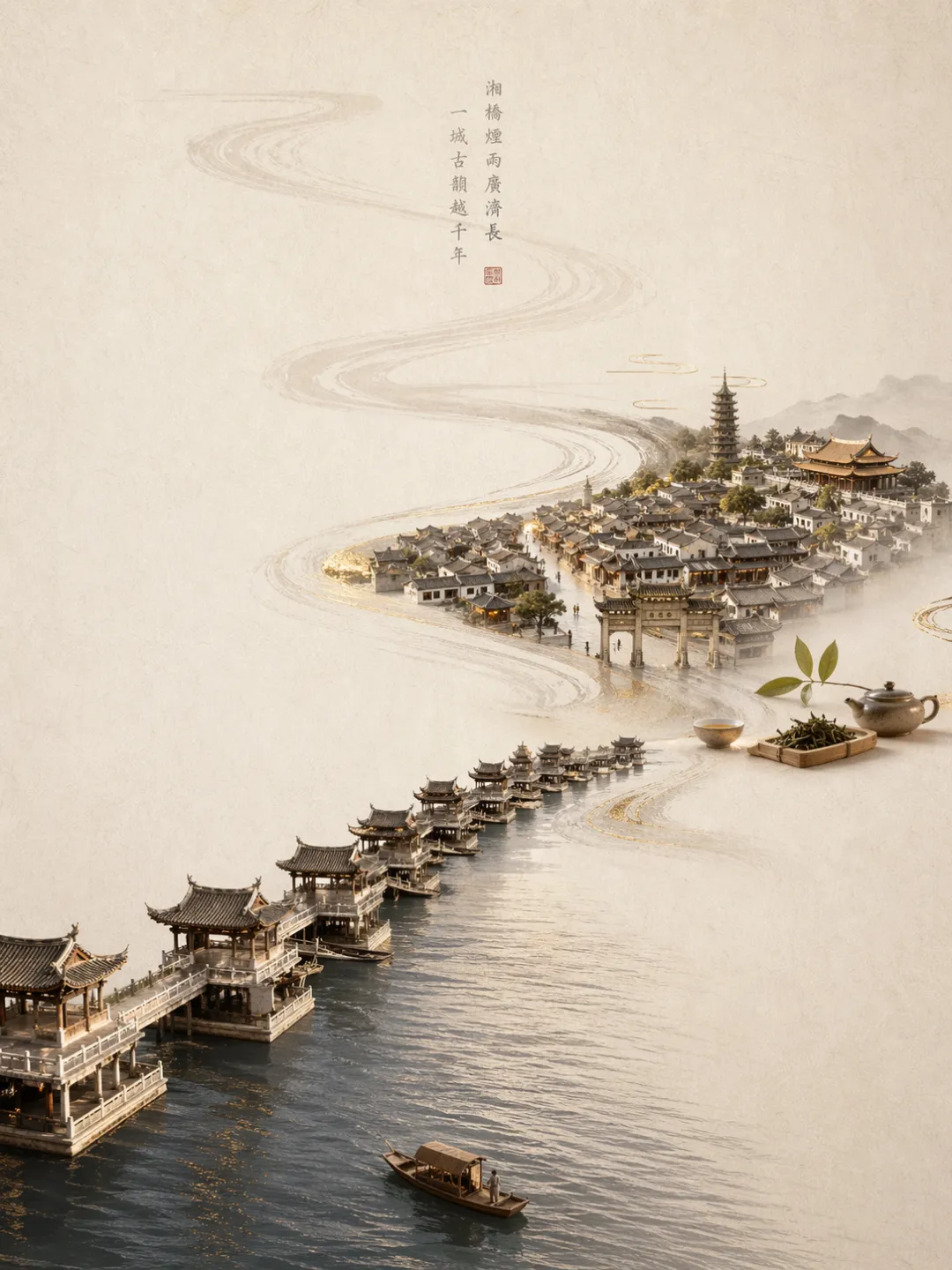 主体:潮州广济桥(带亭台浮桥结构)与微缩古城 构图:3:4竖版,非对称构图,大面积留白,视觉重心偏上 核心视觉结构:一条S型韩江贯穿画面,从下方写实水面逐渐转化为流动线条,最终消散为宣纸肌理 风格:新中式极简东方美学,高端商业视觉 关键元素:牌坊街、开元寺、传统民居、少量茶文化元素 光影:柔和漫反射光,暖金色高光,轻微阴影 材质:暖米白宣纸肌理,纤维清晰,哑光质感 色彩:低饱和中性色调,少量暖金点缀 氛围:安静、诗意、克制、高级感 细节:超精细,细腻纹理,柔和渐变 质量:8K分辨率,高质量输出几个经验