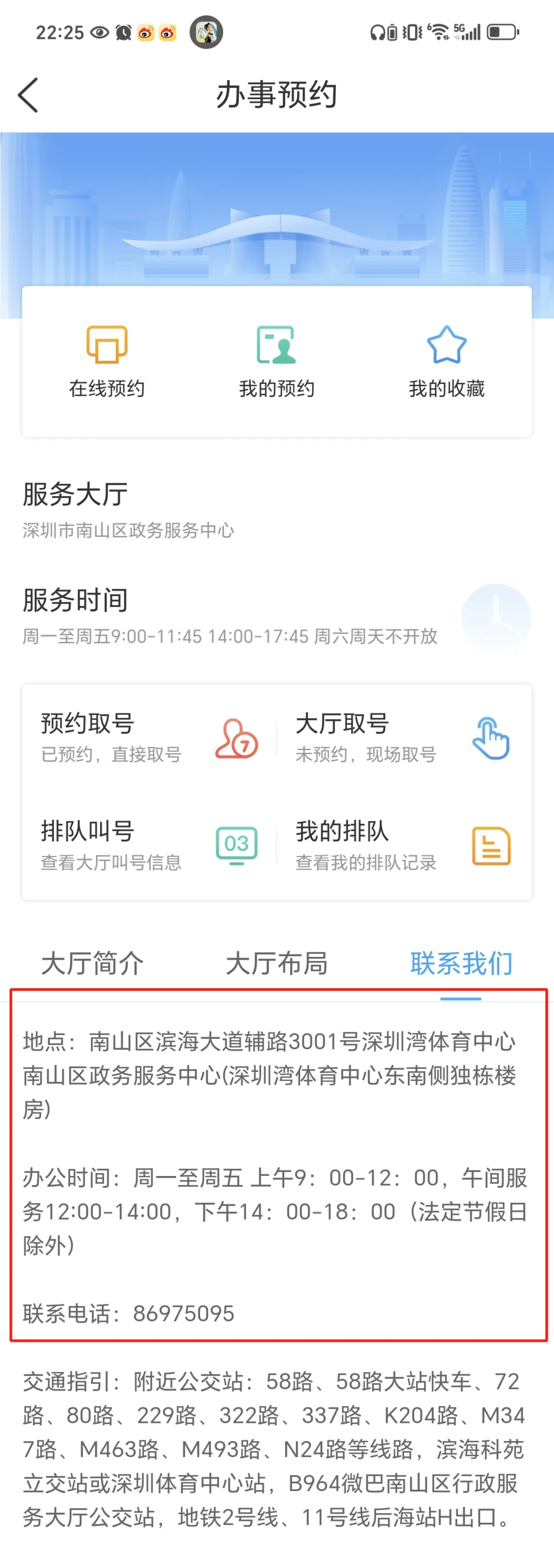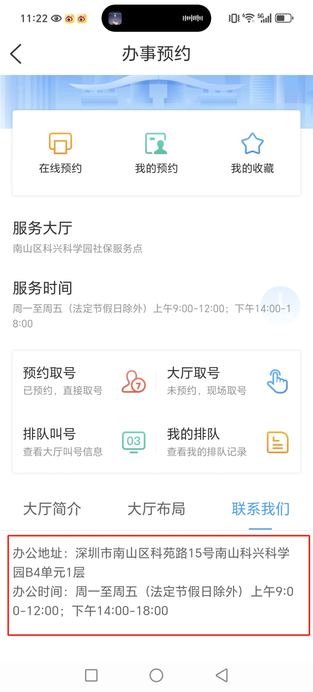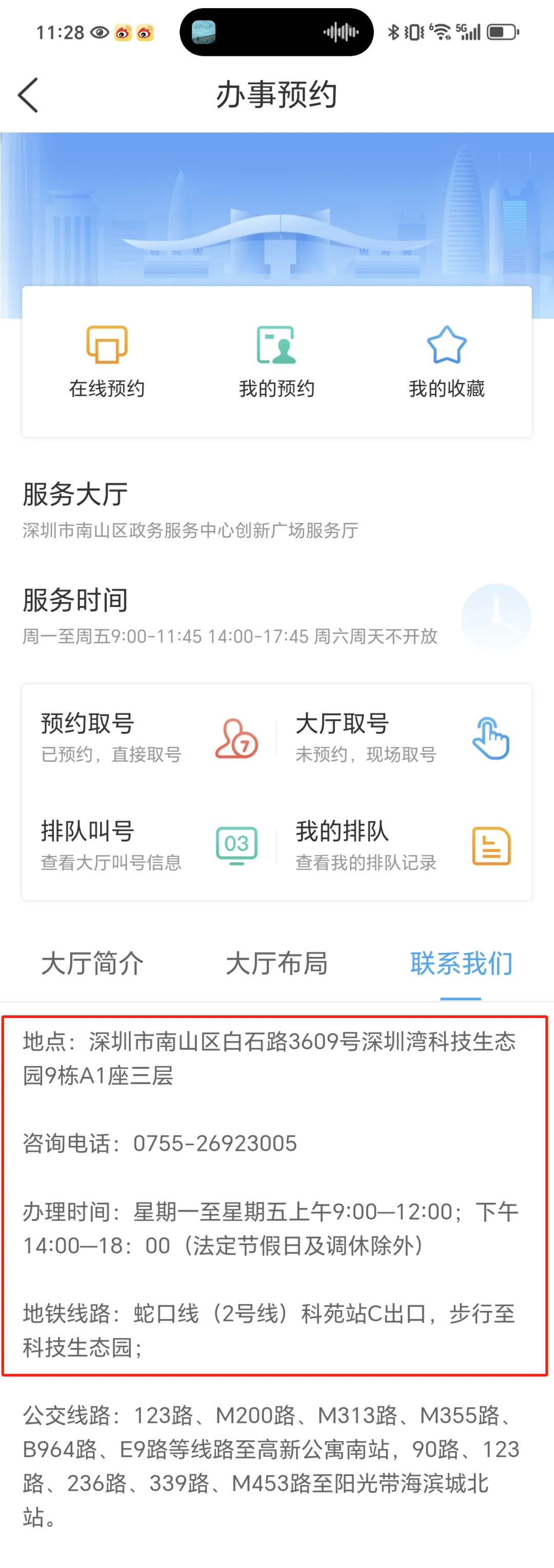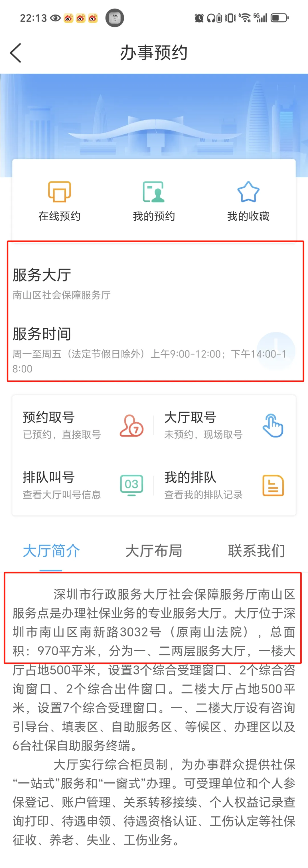 注:没有找到对应预约项目,上拉菜单显示“社保业务大厅”有显示,谨慎选择。地点:南山区滨海大道辅路3001号深圳湾体育中心南山区政务服务中心(深圳湾体育中心东南侧独栋楼)办公时间:周一至周五 上午9:00-12:00,午间服务12:00-14:00,下午14:00-18:00(法定节假日除外)