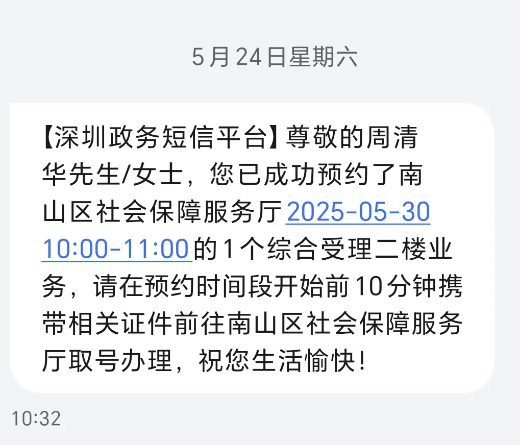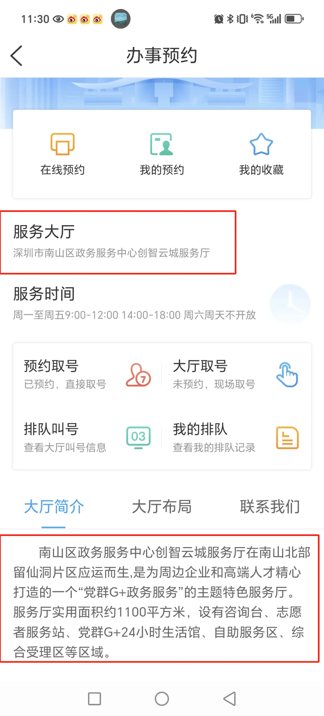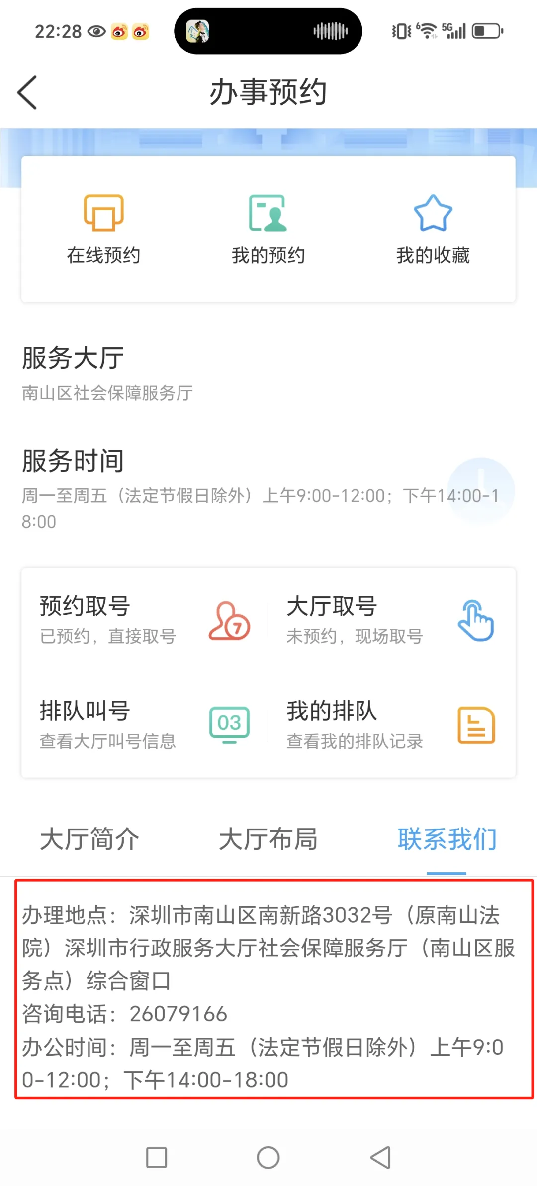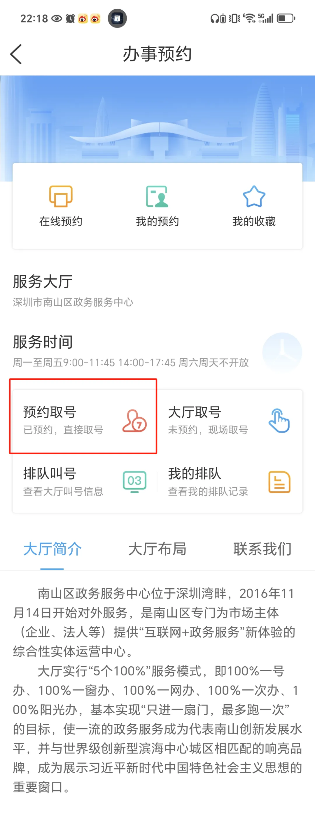 注:没有找到对应预约项目,上拉菜单显示“社保业务大厅”有显示,谨慎选择。地点:南山区滨海大道辅路3001号深圳湾体育中心南山区政务服务中心(深圳湾体育中心东南侧独栋楼)办公时间:周一至周五 上午9:00-12:00,午间服务12:00-14:00,下午14:00-18:00(法定节假日除外)