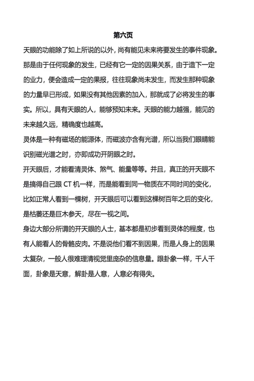开天眼后,才能看清灵体、煞气、能量等等。并且,真正的开天眼不是搞得自己跟 CT 机一样,而是能看到同一物质在不同时间的变化◇比如正常人看到一棵树,开天眼后可以看到这棵树百年之后的变化,是枯萎还是巨木参天,尽在一视之间。