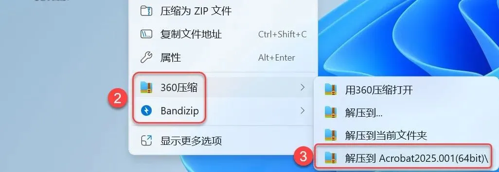 1.解压安装包:①鼠标右击【Acrobat2025.001(64bit)】压缩包②选择电脑上安装的解压软件(如:360压缩)③点击【解压到 Acrobat2025.001(64bit)】。