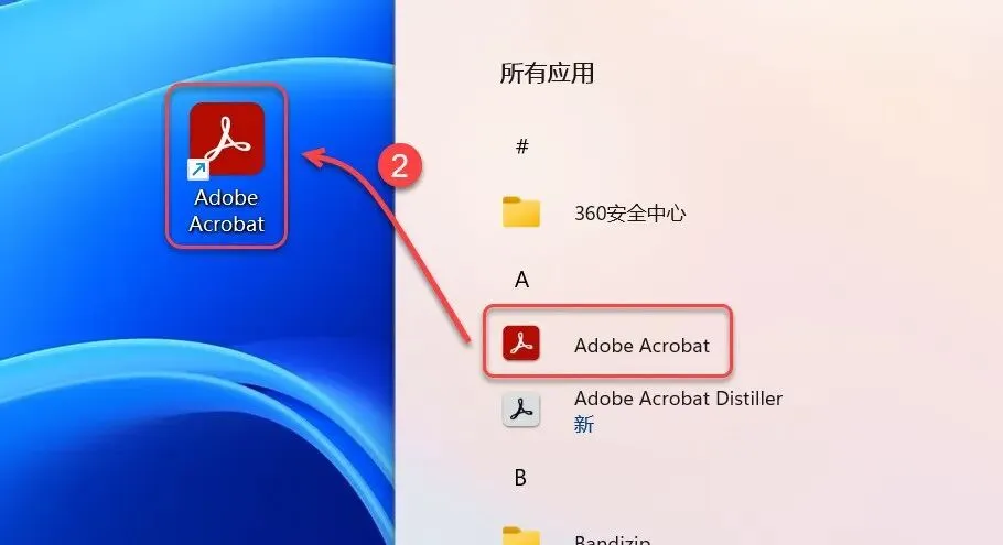 7..创建桌面快捷方式:①点击桌面任务栏中的【开始图标】>点击【所有应用】②将【Adobe Acrobat】图标拖到电脑桌面。