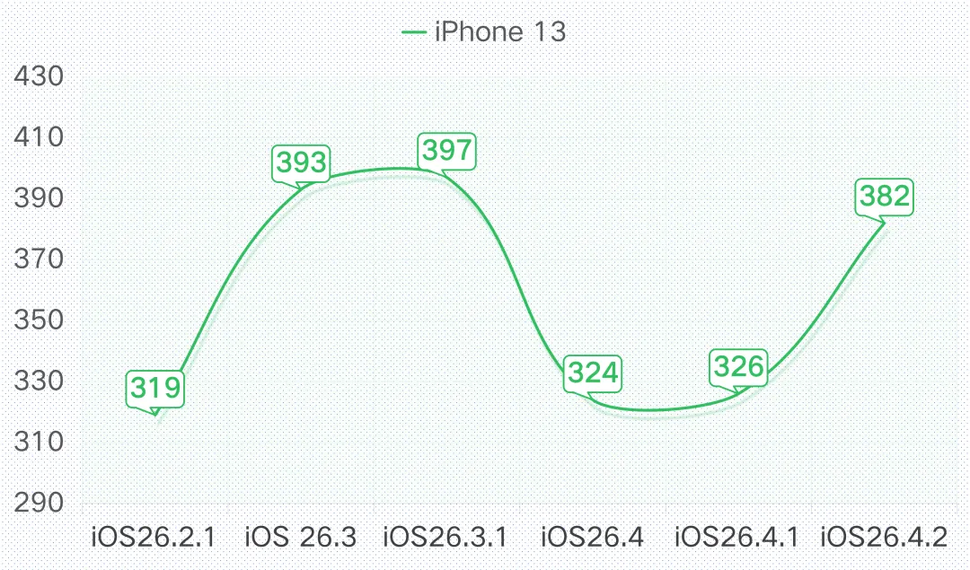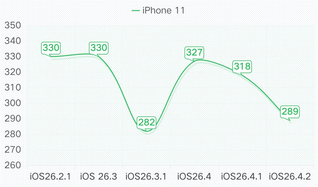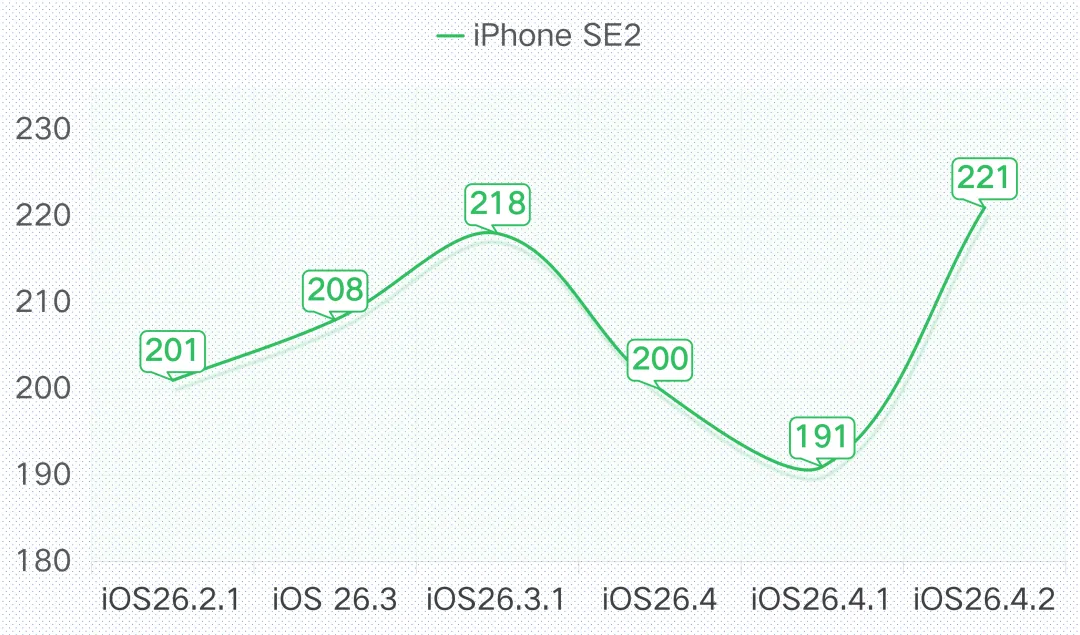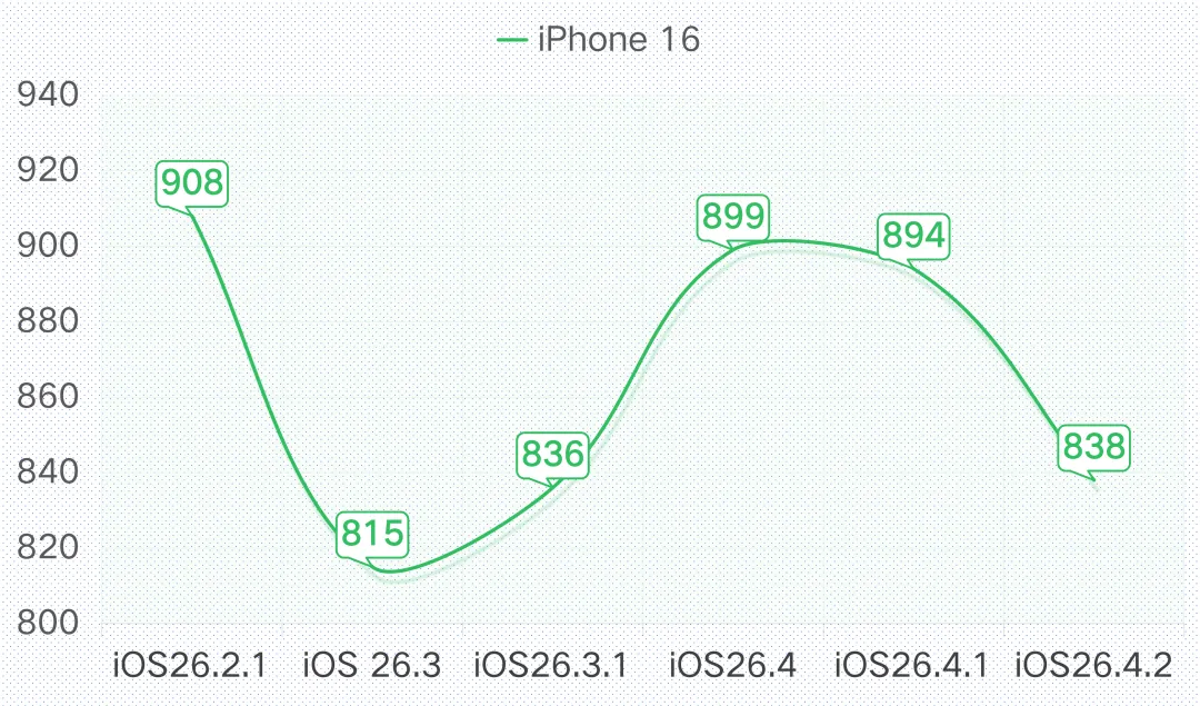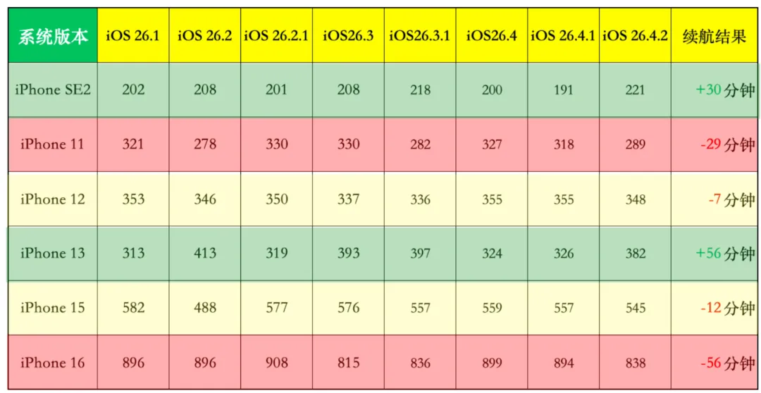 就当前数据而言,相对于iOS 26.4.1正式版,iOS 26.4.2正式版在续航方面的表现,最对对不起的当属iPhone 16和iPhone 11了,毕竟这续航下降的也太离谱了。
