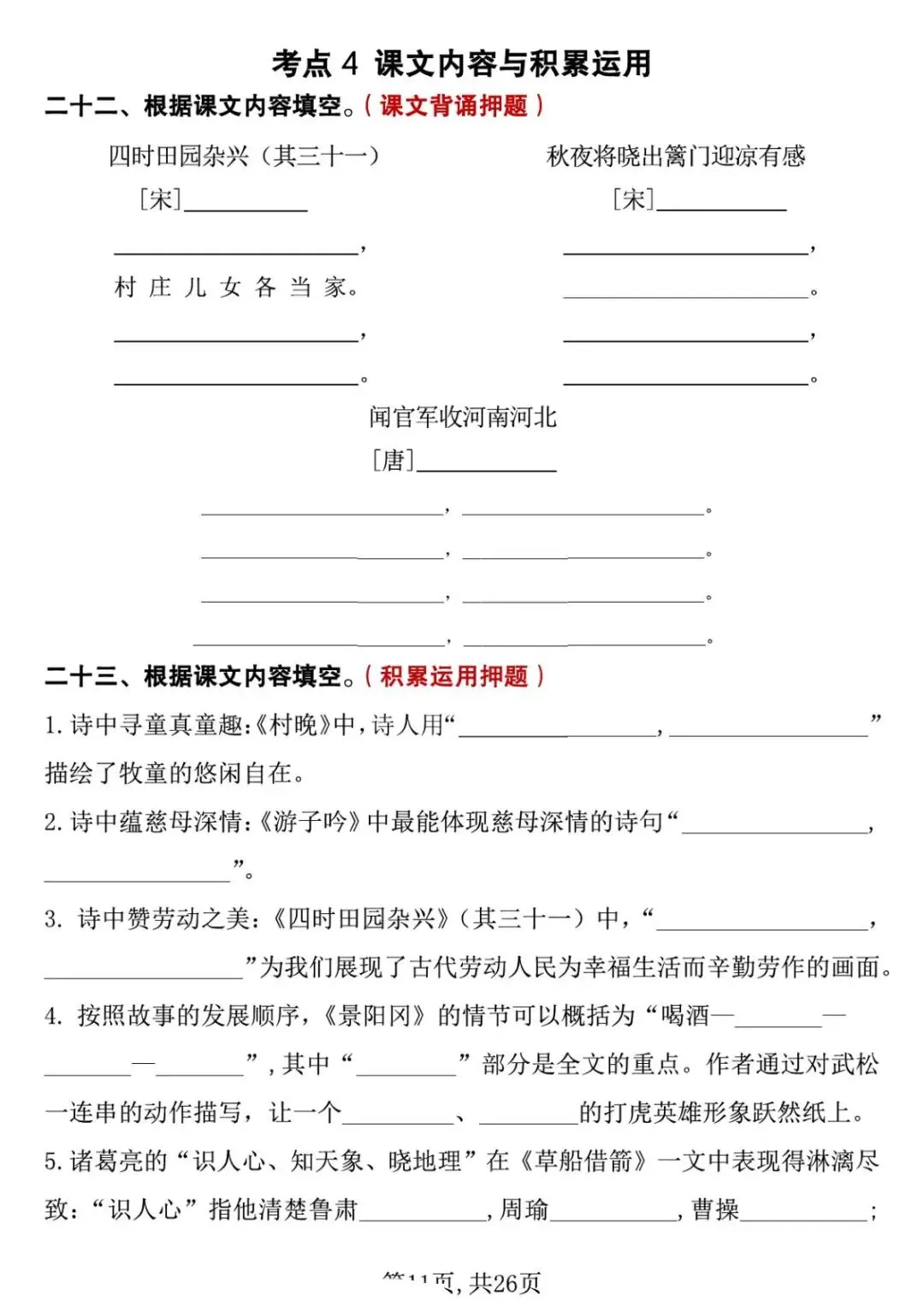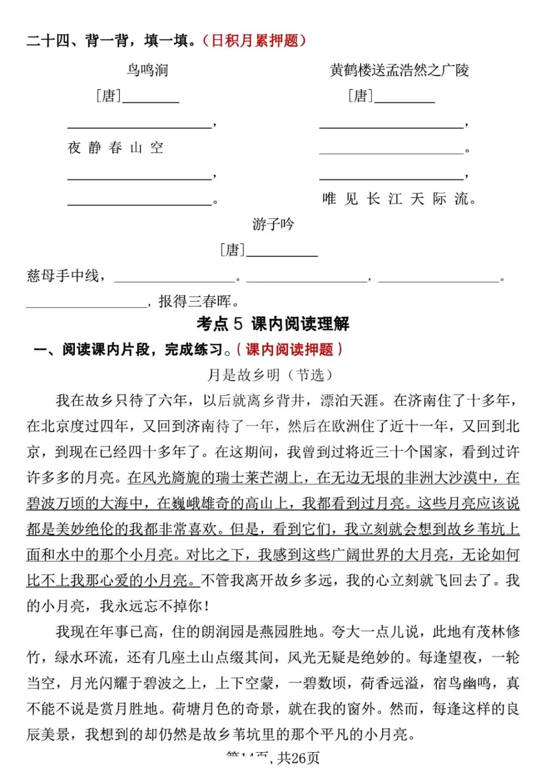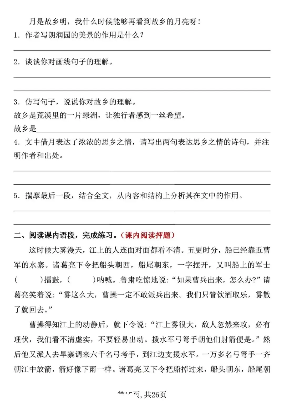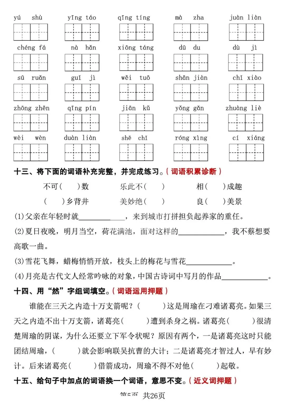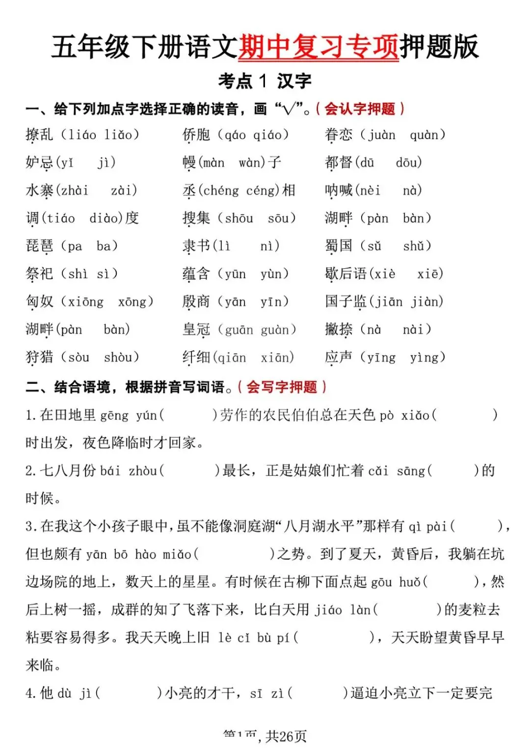 五年级下册语文期中复习专项押题版,含答案共26页,电子版可下载打印。