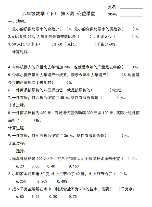 公益课堂|青岛版63制六年级数学(下)第8周练习及答题卡(文末附下载链接及参考答案)好好学习报效祖国 公益课堂第8周:公益课堂电子版下载链接:点击文末左下角“阅读原文”,输入提取码:8888,即可获取电子版资料。