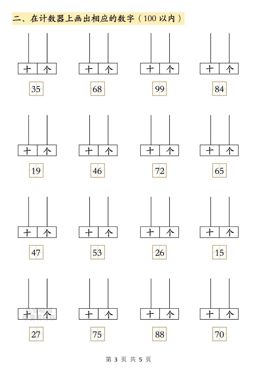 这份文档是2026春一年级下册数学常考易错专项练习,围绕100以内数的认识与读写,包含计数器的读作写作、在计数器上画数字两类题型,并附有完整参考答案。