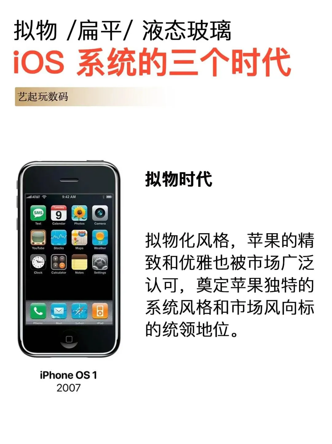 iOS 1(iPhone OS 1,2007 年):这是一切的开始。首次将多点触控技术带入主流,用手指滑动、捏合、缩放的操作方式彻底颠覆了传统的物理键盘手机。它整合了电话、iPod、互联网浏览器三大功能,创造了智能手机的全新概念。重新定义了手机的形态和交互方式,开启了移动互联网时代。