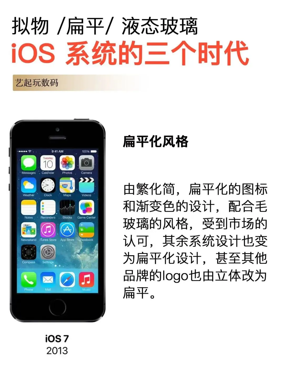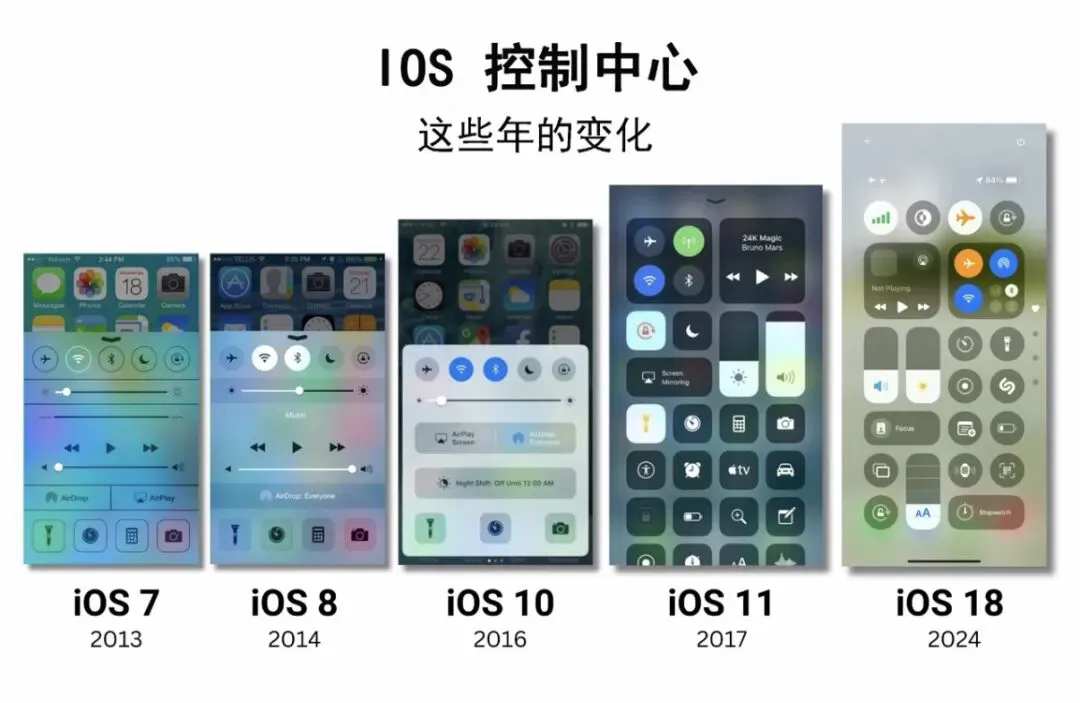 iOS 7(2013 年):这是 iOS 历史上最重大的一次设计变革,彻底抛弃了拟物化风格,转向扁平化设计。新增了控制中心、AirDrop、Touch ID 支持和 iTunes Radio。奠定了之后 12 年 iOS 的设计基调,影响了整个行业的 UI 设计方向;控制中心让常用功能触手可及。