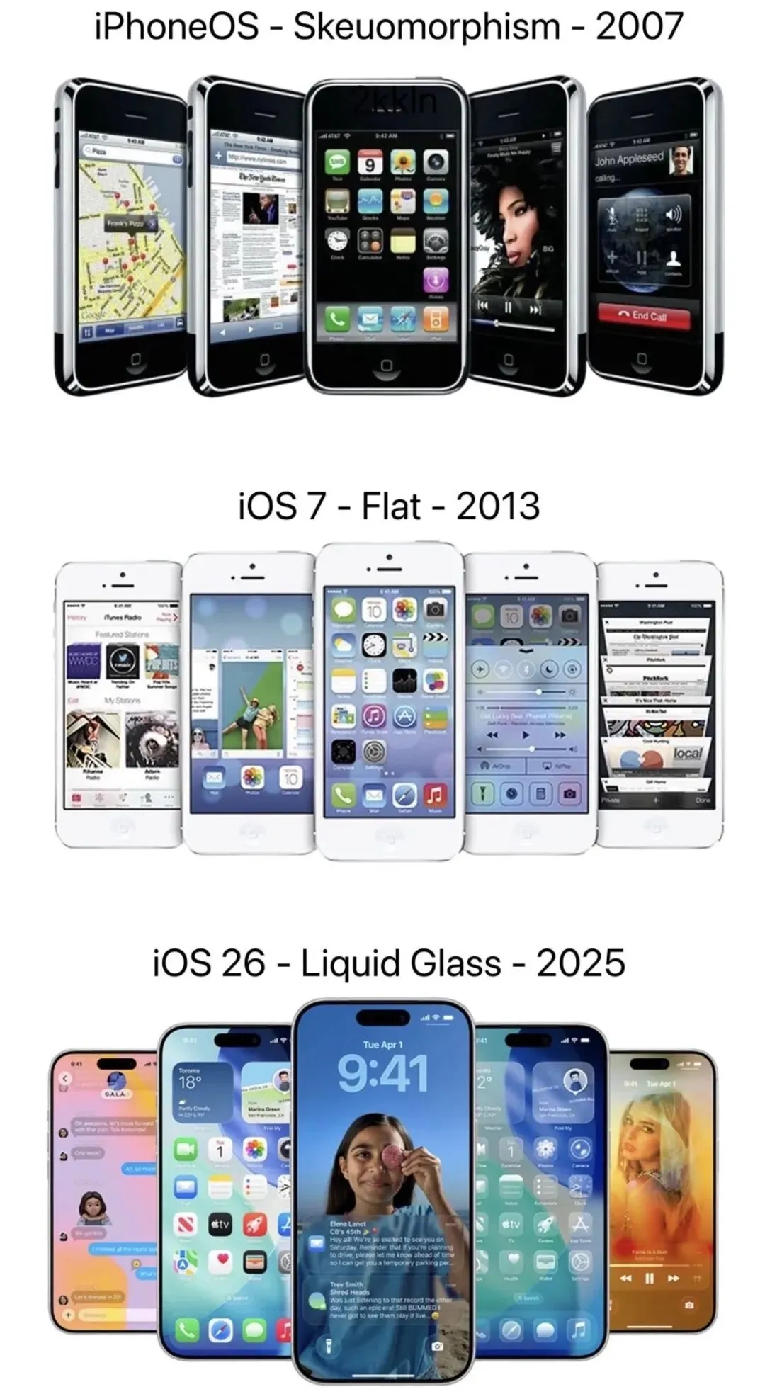iOS 17(2023 年):新增了待机显示、联系人海报、隔空投送名片投送和实时语音转文字。让充电时的 iPhone 变成一个智能显示屏;联系人海报让通话界面更加个性化。