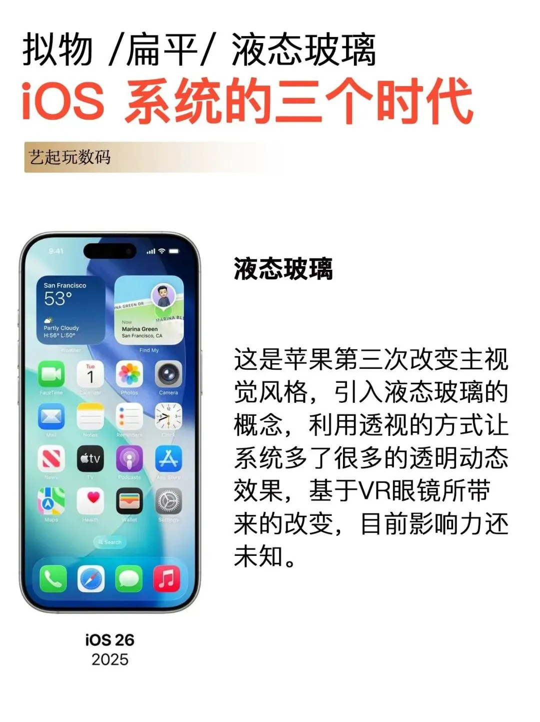 iOS 26(2025 年):苹果放弃了传统的数字命名方式,改用年份命名。这是自 iOS 7 以来最重大的一次设计变革,推出了Liquid Glass(液态玻璃)设计语言,整个系统界面都采用了半透明、动态光影的玻璃质感。